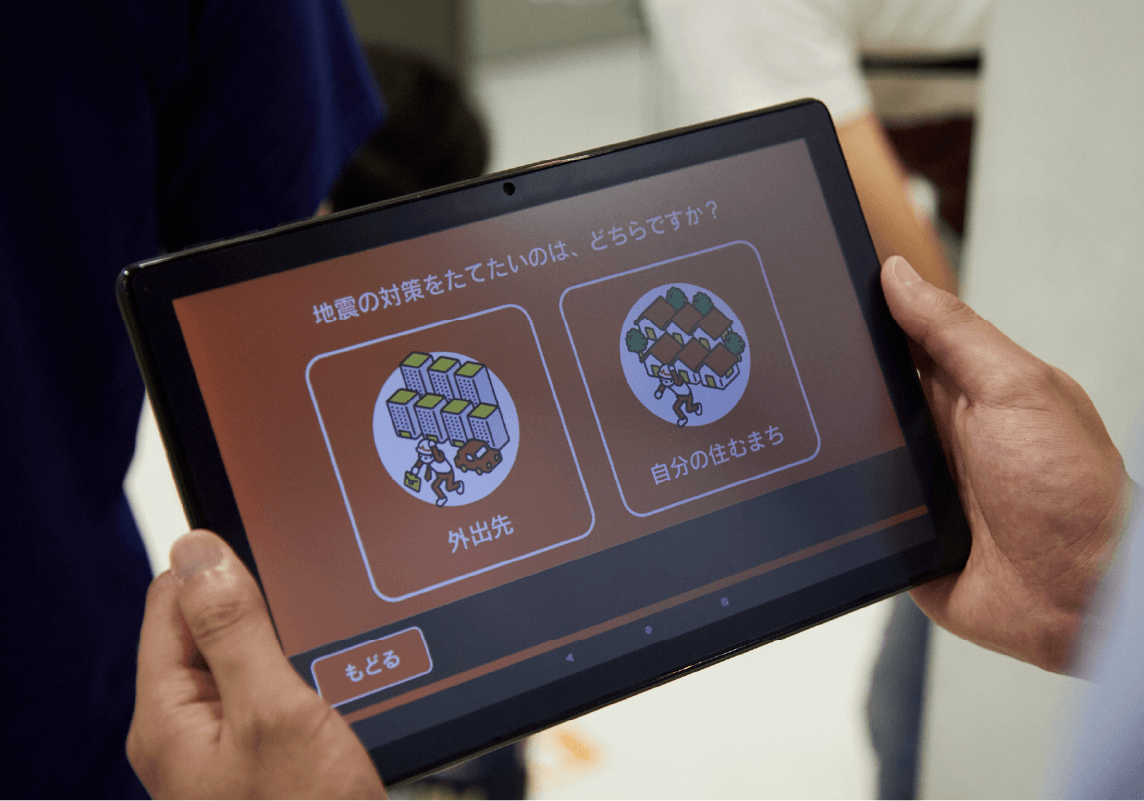 中に入るとひとりひとりにタブレットが渡されます。ツアーは外出先か自分の住むまちの2つからコースを選びます。映し出されるクイズに答えたり、カメラ機能を使ったりしながら進んでいきます。