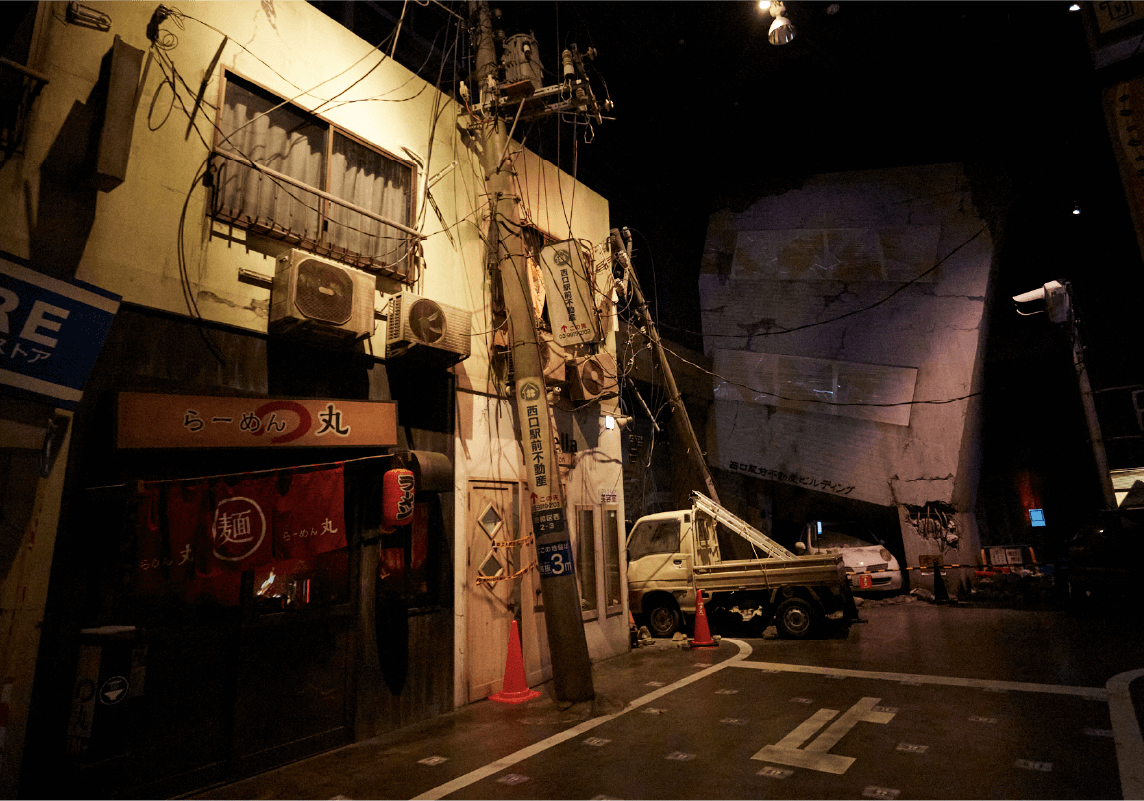 しばらくするとドアが開き、通路を抜けると外に出られることに。ところが、目の前に広がったのは被災した街でした。