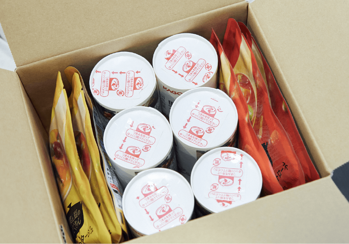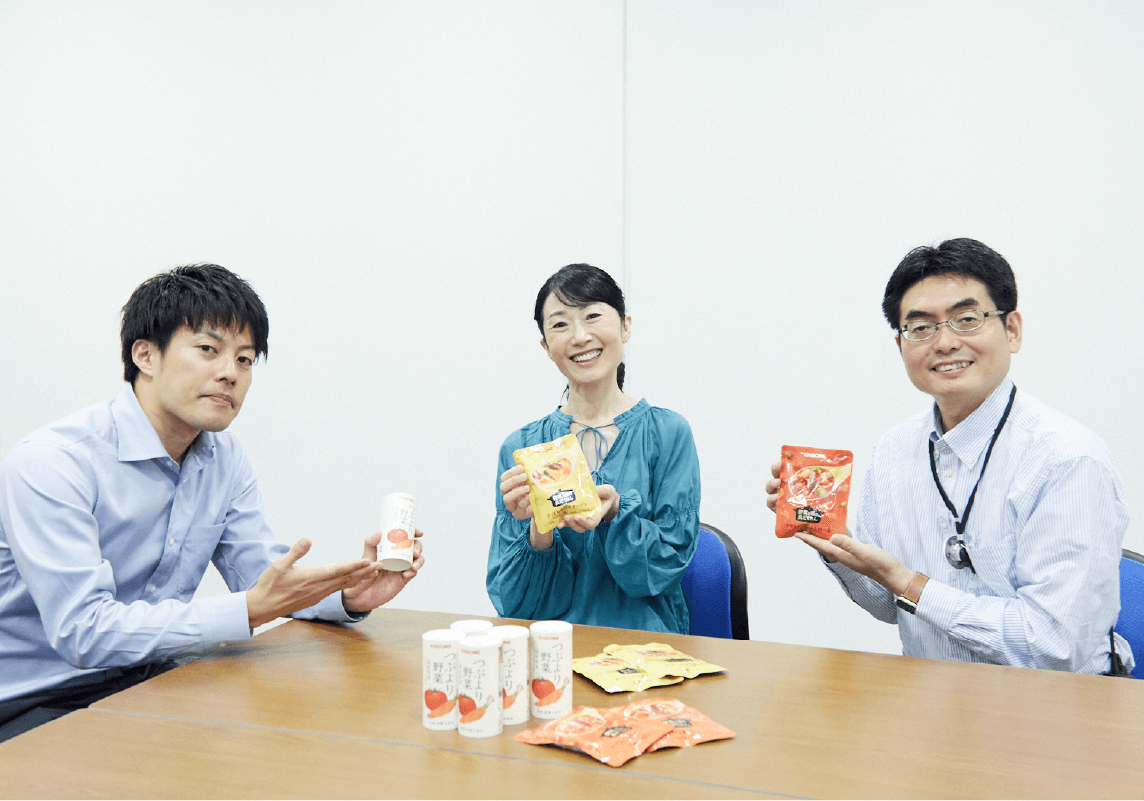 【細川】ここで、9月から数量限定で販売する「野菜の常備食セット」をご紹介させていただきます。2種類の「野菜と豆の具だくさんポタージュ」が3袋ずつ、そして「つぶより野菜」が6本入っています。