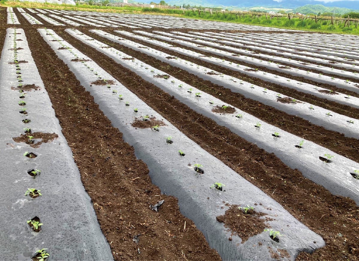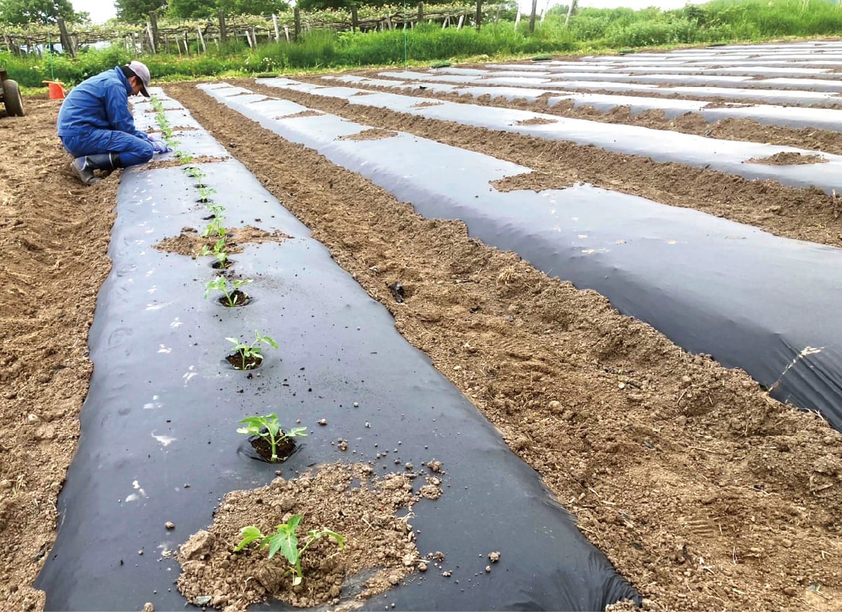 移植した『爽果』の苗を一本一本“手作業”で丁寧に押さえ、活着を促していく。