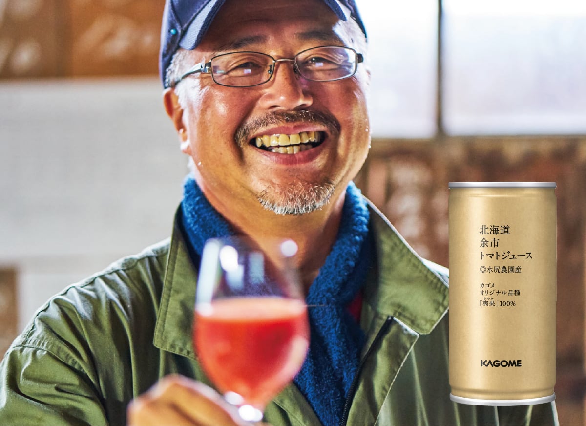カゴメが新しい味わいのトマトジュースづくりのために、10年もの歳月をかけて開発したオリジナル品種『爽果』を、日本で唯一栽培してくださっている水尻さん。