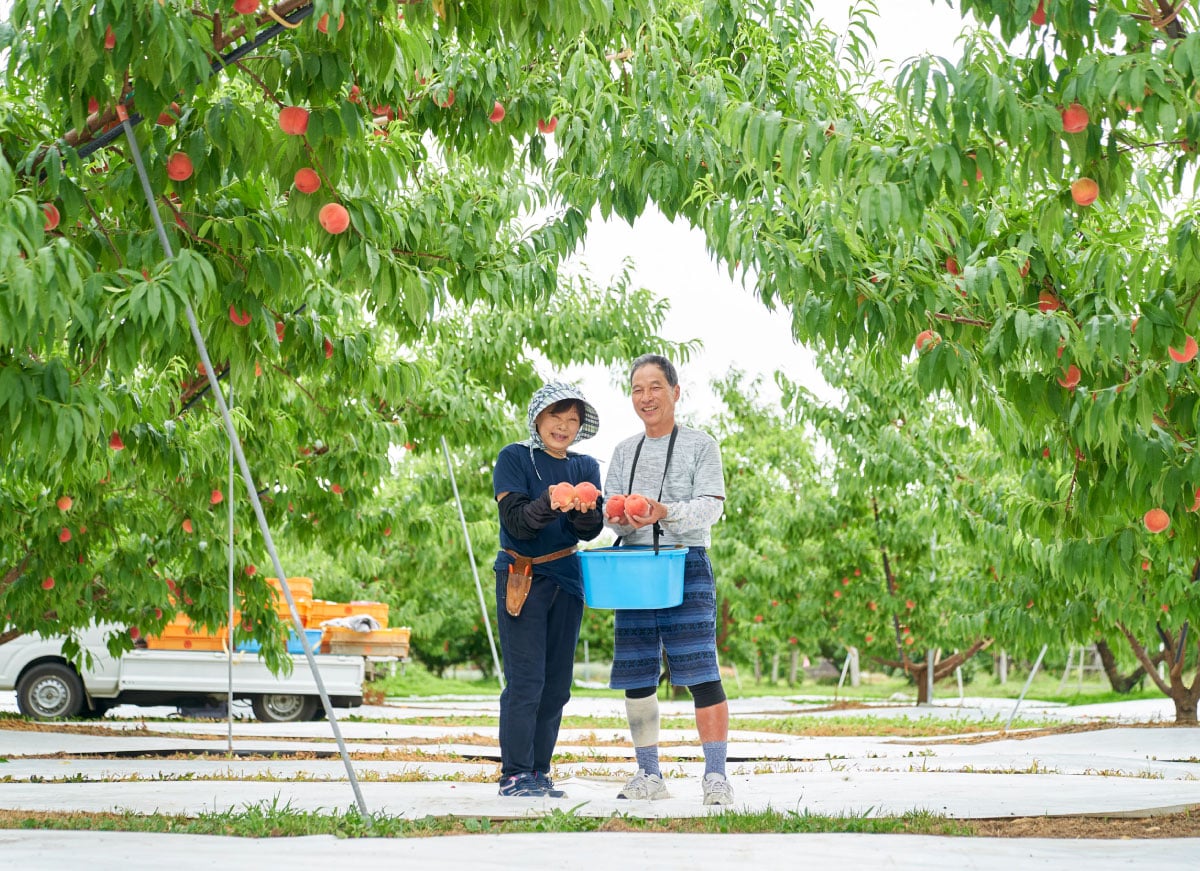 桃の栽培名人は、奥さま照子さんと仲睦まじく畑に立つ。
