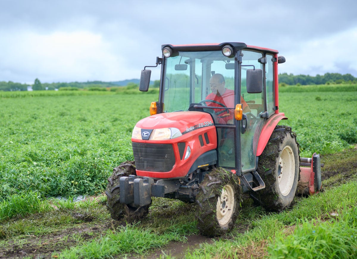 訪問時の岩崎さん、颯爽と赤いトラクターで作業中。