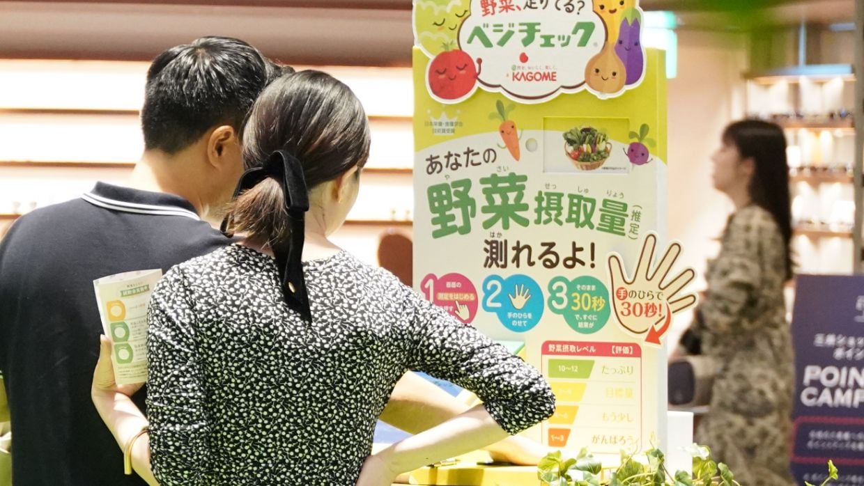 「ベジチェック®」はカゴメが開発した手のひらをセンサーに約30秒押しあてるだけで推定野菜摂取量を測定できる機器。皮膚のカロテノイド量を測定し野菜摂取量を推定しています。日本人の平均は5.5点!ちょっとドキドキしながら測定結果を待ちます。