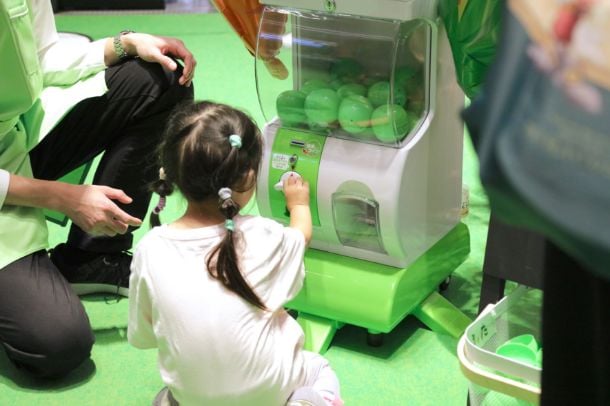 カゴメ健康直送便の商品や限定グッズなどがあたる大人向けガチャガチャでは思わずガッツポーズをされるお客さまも。