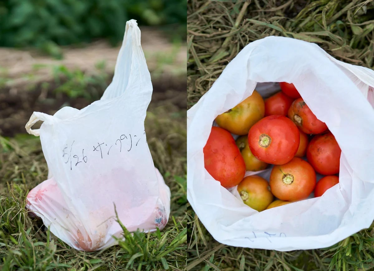 訪れた畑で出荷前の「残留農薬検査」のためサンプリング。サンプルはカゴメの研究所に持ち帰り、トマトの安全性を厳しくチェック。美味しさはもとより、カゴメはお客さまの安全・安心を第一に徹底。