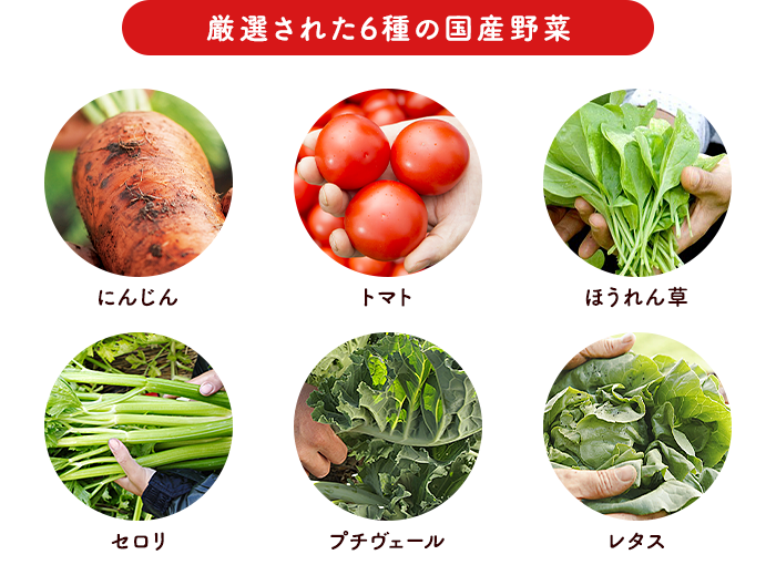 厳選された6種の国産野菜、それぞれの野菜が持つ「個性」と「おいしさ」を最大限に引き出すために、80年以上にわたる野菜と向き合ってきた歴史の中で培われた、野菜ごとの最適な搾汁方法を編み出しました。