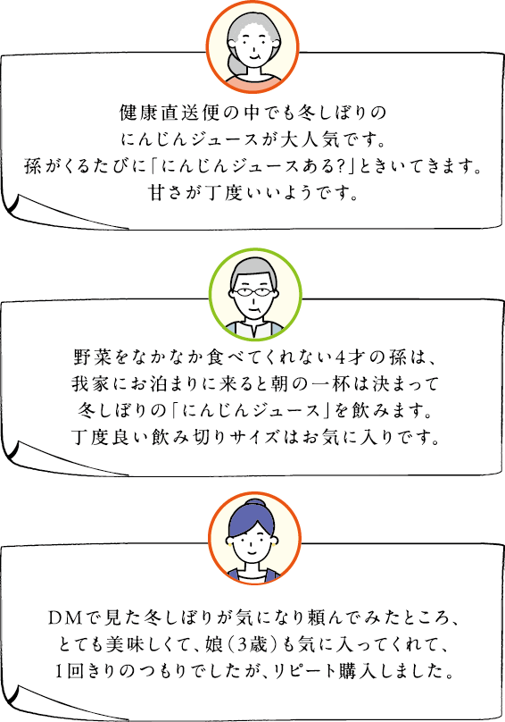 それでも「旬の冬にんじんの美味しさを、何としてもお客様に味わっていただきたい」という強い想いを胸に、私たちに力を貸してくださる農家さんを探し、訪ね歩き、交渉を重ね、ようやく「冬しぼり」誕生にこぎ着けたのです。