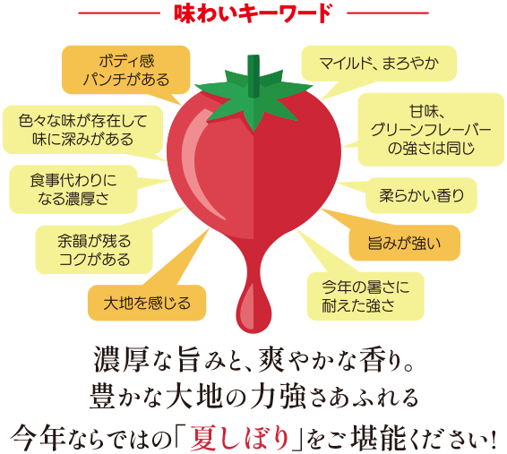 チューリップのような広がった形状。グラスの空間にトマトジュースの香りが滞留し、空気と混ざって「夏しぼり」の華やかな香りが、グラスの空間いっぱいに広がります。ワインのようにグラスを回して、華やかな香りをお楽しみください。