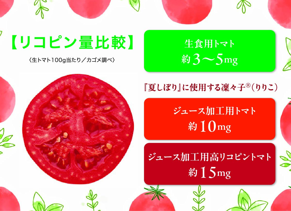 「『夏しぼり』には『凜々子®』が100%使用されています。しかも、その年の夏に収穫したばかりの“旬”の美味しさが詰まった完熟トマトだけを搾ります」。