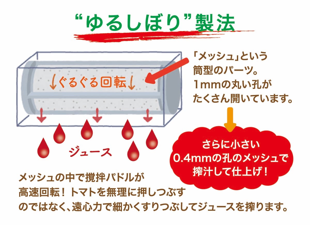1996年に開発されたカゴメ独自の[ゆるしぼり]製法のメカニズム。