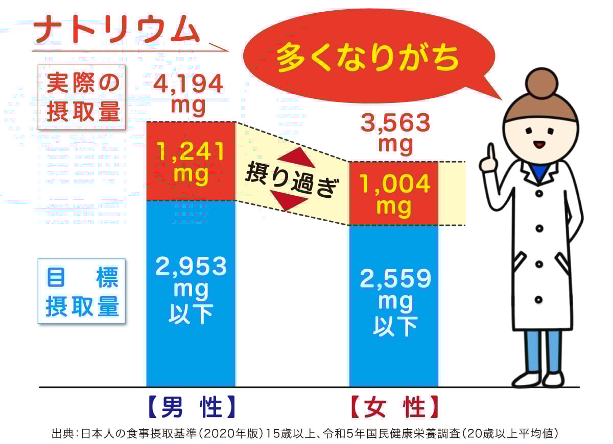 事実、〈ナトリウム〉摂取量は多くなりがち。