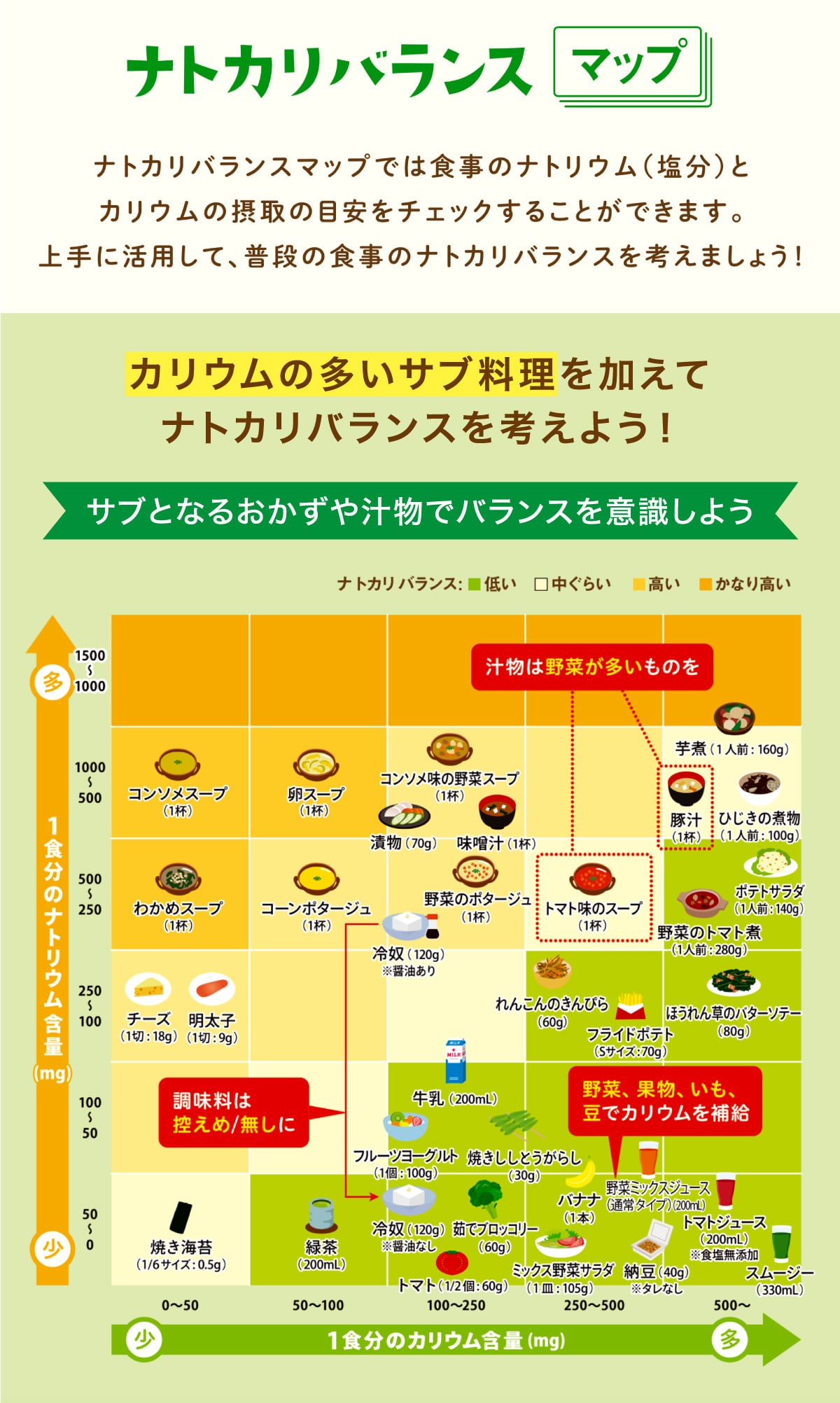 ちなみにナトカリバランスの良い食生活を考える上で、指標になると思われる[ナトカリバランスマップ]を以下にご紹介します。ぜひ日々の食生活の参考にしてみてください。