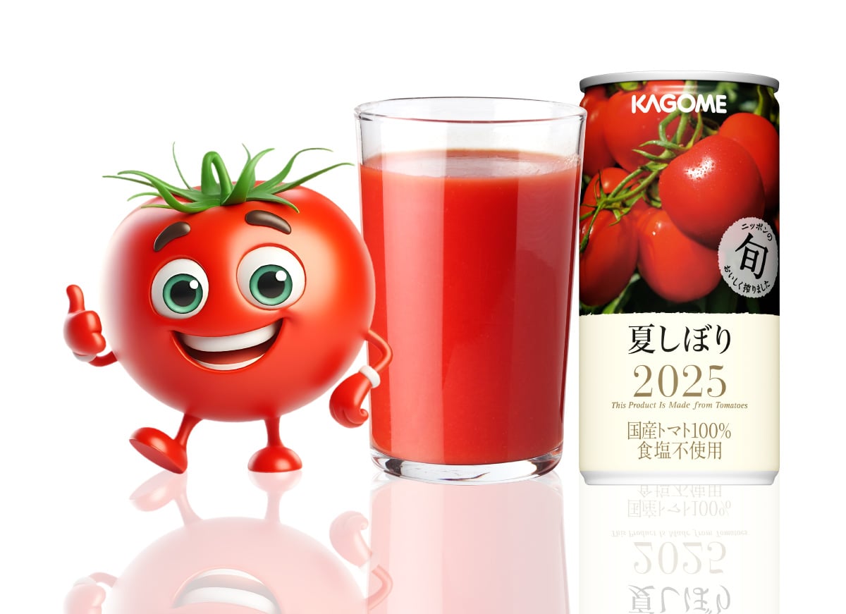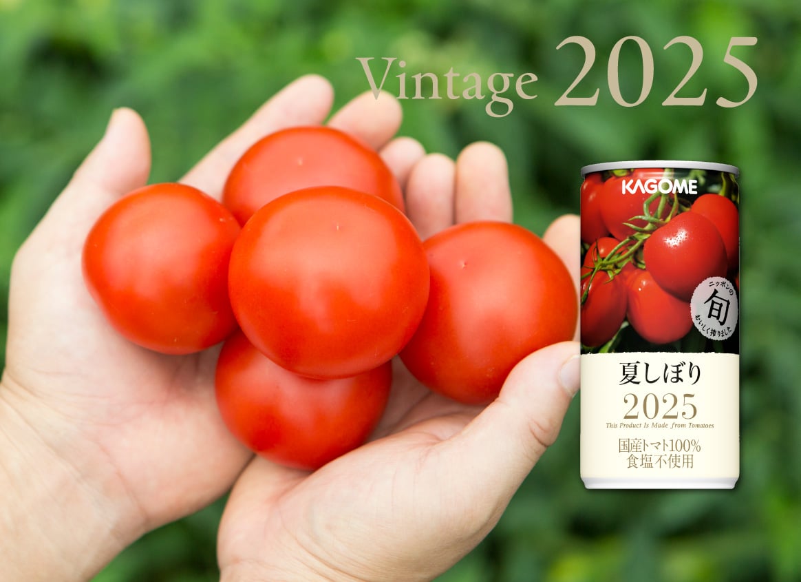 トマトジュースの中でも特に『夏しぼり』の場合、その年の夏に収穫された“旬”の完熟トマトを搾っているので、トマト自体の素材の味わいがしっかり感じられ、さらに後味はスッキリ爽やか。食中でも、食後でも、美味しく、楽しくお召し上がりいただけることと思います。