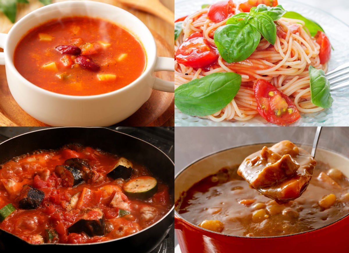 たとえば王道の「トマトスープ」や「ミネストローネ」など、トマト自体の味わいを楽しむスープ系。さらに特に暑い季節に人気の高いのが、「冷製パスタ」や「そうめん」等の麺類系。色とりどりの夏野菜を楽しむ料理として、夏野菜をトマトで煮込む「ラタトゥイユ」に使われるお客様もいらっしゃいます。これらのトマト系メニューは、料理自体にも野菜がたくさん使われているので、〈カリウム〉摂取の一助になりそうです。