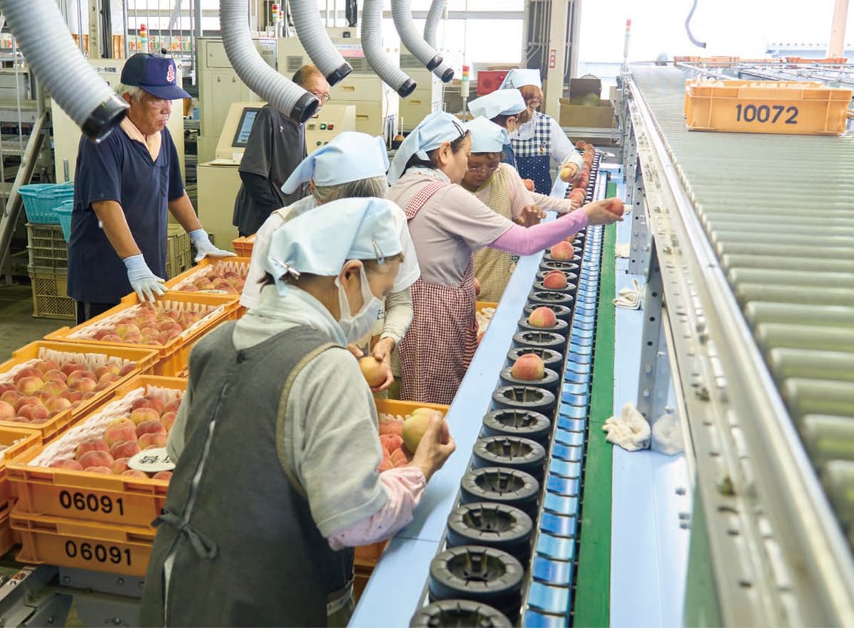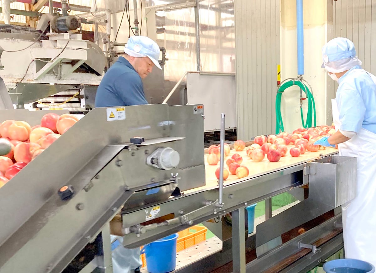 桃が出荷時期を迎える夏は、「伊達果実農業協同組合」が一年の内で最も忙しい季節。熟練の桃の目利きの方々が、続々とベルトコンベアーを流れてくる桃の品質チェックを、厳しい眼で行っています。1つ1つ丁寧な手作業でありながら、極めて手際の良いその作業風景は、まさに壮観とも言えるもの。
