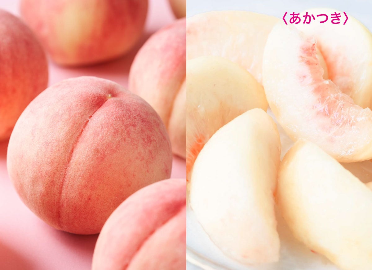 上品なお姫様のような〈あかつき〉と、堂々たる桃の王様〈川中島白桃〉。いずれも日本トップクラスの生産量を誇る人気品種で、桃の最大の魅力ともいえる“糖度の高さ=甘味”も特徴です。