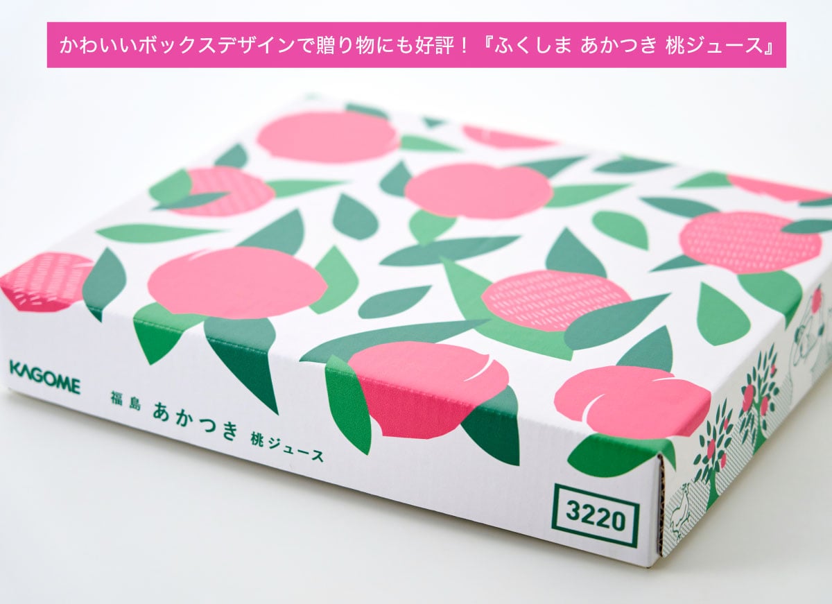 桃はとってもデリケート。果物の中でも特に“旬”が短く、美味しく味わえる期間が短いことが唯一の課題です。そこでカゴメが福島の桃の農家さんたちの協力を得て、一年中好きな時に楽しめるように、もぎたての〈あかつき〉を搾ってジュースにしたのが『ふくしま あかつき 桃ジュース』。