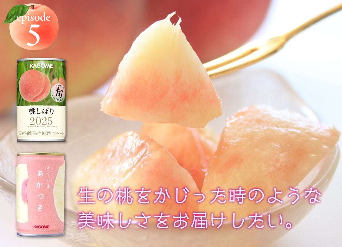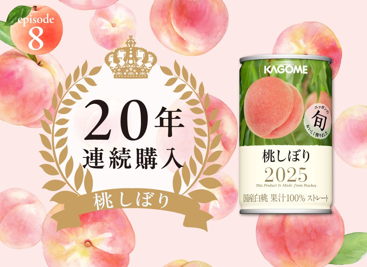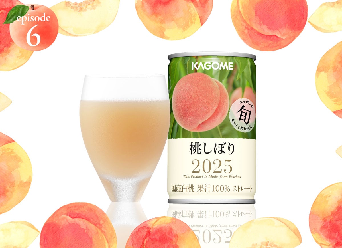 こうした難しい状況がありながらも、『桃しぼり』は、2003年から多くのお客様にご愛飲いただいている大切な商品です。私たちカゴメはこの夏も、“旬”の良質な桃の調達に汗を流し、また集めた桃のブレンド技術にもさらなる磨きをかけて、“夏の風物詩”ともいえる桃の美味しさをお届けすべく準備を進めています。2025年の『桃しぼり』にも、どうぞご期待ください。