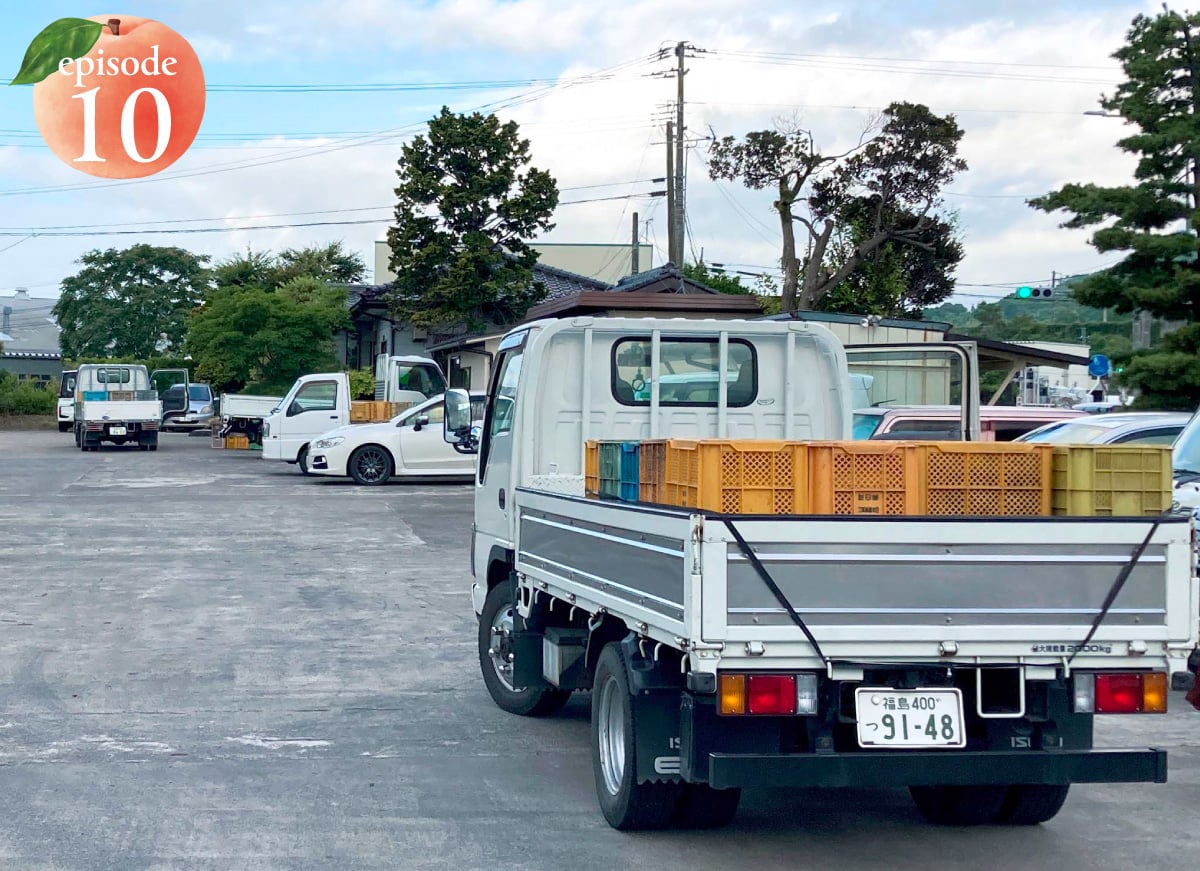 桃が美味しく熟す盛夏の作業は、ようやく空が明けかかる早朝5時頃から始まりす。駐車場には桃を収穫するための空のコンテナを積んだトラック。熟練のドライバーが乗り込んでは、一台ずつ担当する桃農家さんや畑に向かって出発していきます。