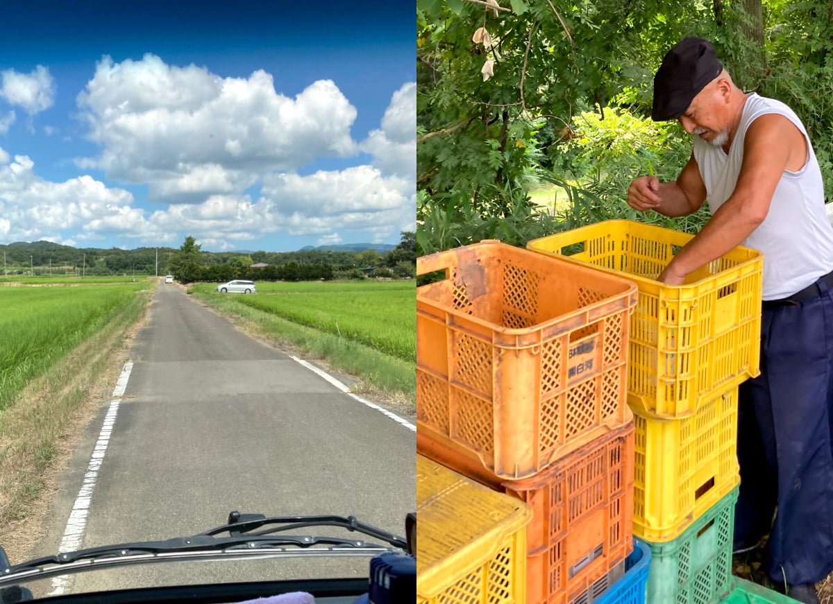 桃の集荷置き場へと続く道は、細い農道やデコボコの畦道も多く、運転の技量も求められます。収穫最盛期の5時頃といえば、既に畑に出ている農家さんも多く、早朝と言えども車もチラホラ、安全運転にも充分気をつけて。