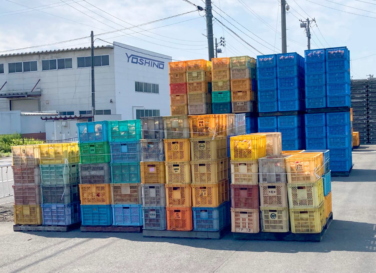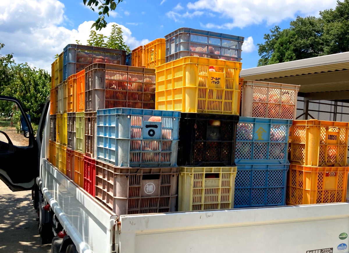 まず集荷作業は、荷台に積んだ空のコンテナを、桃農家さんごとに決められた集荷置き場に届けることから始まります。到着時には、既に前日届けてあったコンテナに、もぎたての桃が収められて積まれているケースも多く、その場合は空のコンテナと入れ替えに満杯のコンテナを積んで、次の農家さんの置き場へと回ります。