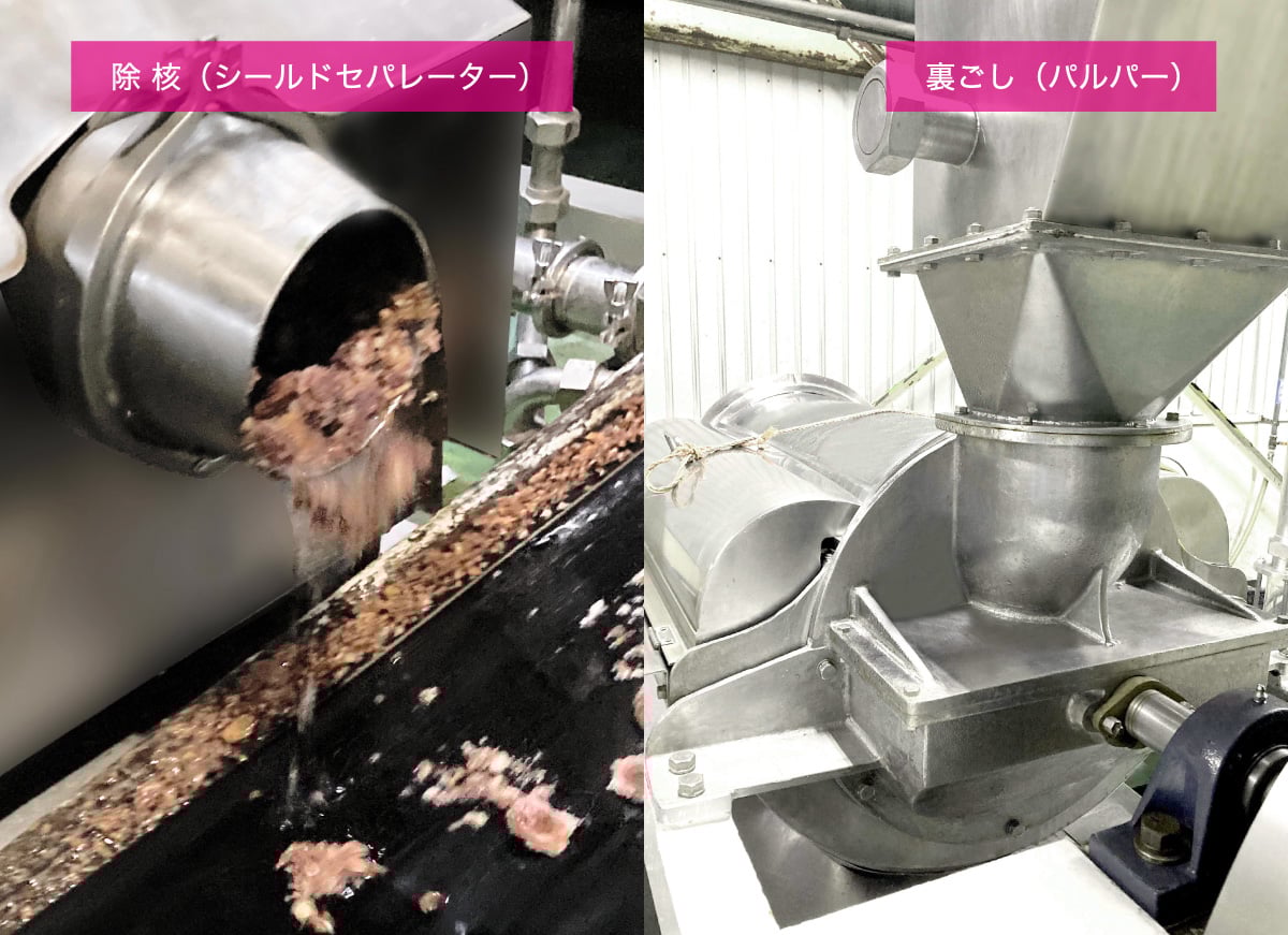 続いて[裏ごし]の工程。裏ごしは料理でもお馴染みですが、ここにはさらに2つの工程があります。裏ごし第1次工程は[除核(シールドセパレーター)]という機械を通して、まず種などの大きな夾雑物を取り除きます。