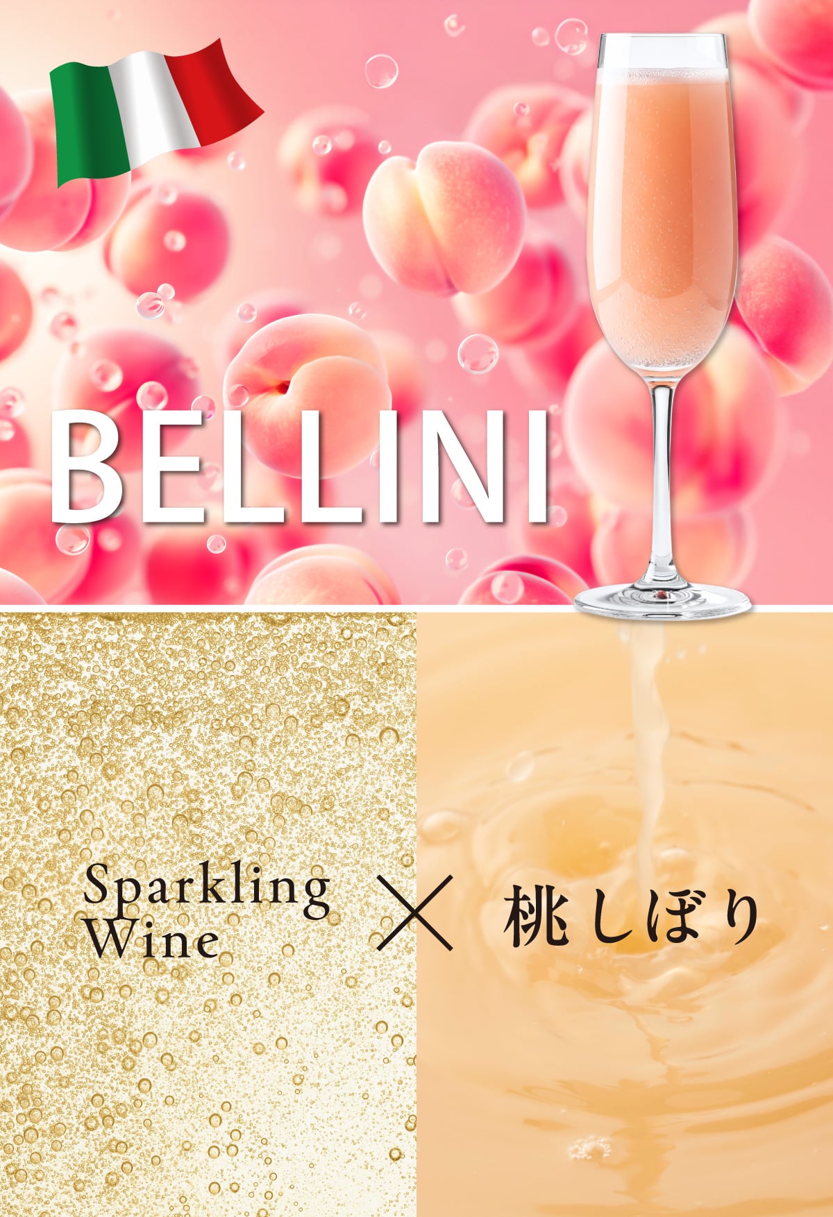 オリジナルレシピは、生の桃のピューレにスパークリングワインを合わせたものですが、ここではピューレの代わりに、“旬”の桃を搾った100%ジュース『桃しぼり』を使って作ってみましょう。生の桃を使った濃厚な甘さはありませんが、爽やかな桃の香りとスパークリング感で、ひと味違ったスムースな美味しさに。