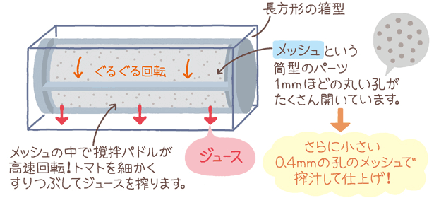 上図で紹介した孔の開いた筒(メッシュ)の中でヘラのようなパドルがぐるぐる回転し、搾りやすくなるようやわらかくしたトマトを裏ごしするイメージ。