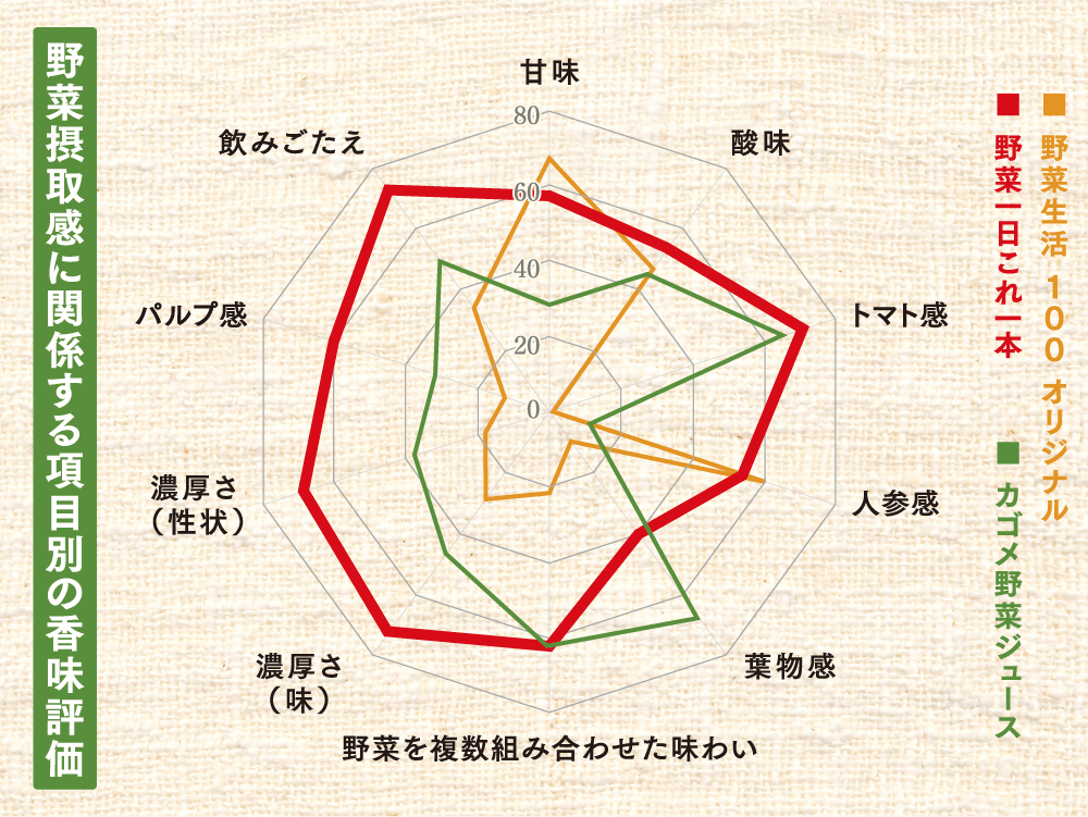 野菜不足を感じているみなさまに、より野菜を摂取している実感をお届けしたい。そんな想いで「飲みごたえある濃厚な味わい」を大切に、発売当初から改良を続けています。30品目という多品目の野菜を組み合わせながらも、バランスの取れた奥深い野菜感をぜひ感じてください。