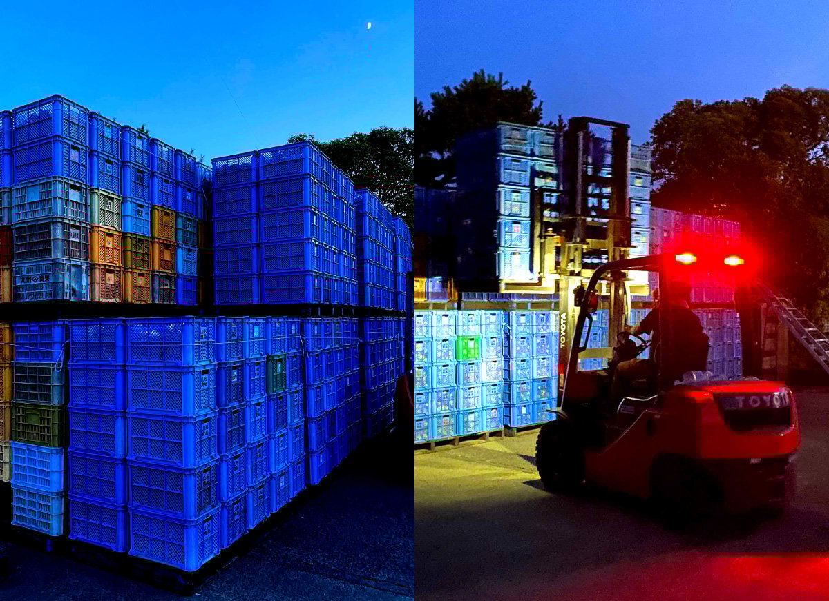 桃が美味しく熟す盛夏の作業は、ようやく空が明けかかる早朝5時頃から始まりす。駐車場には桃を収穫するための空のコンテナを積んだトラック。熟練のドライバーが乗り込んでは、一台ずつ担当する桃農家さんや畑に向かって出発していきます。