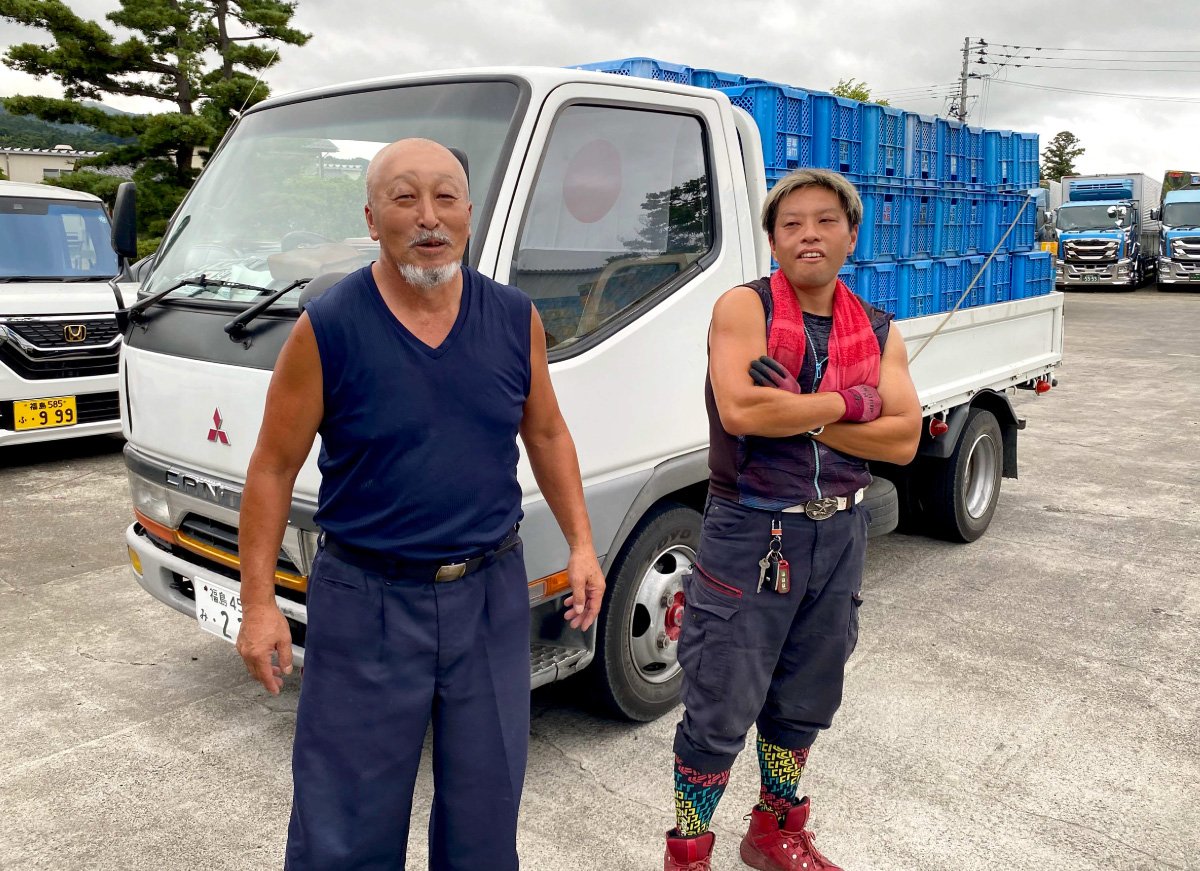 ここでクイズです。1函のコンテナにもぎたての桃が詰まった状態で、その重量はどれくらいになるでしょう?答えは約20kgだそうです。トラックを一杯にするには、20kgのコンテナを100回も積み込まなければなりません。特に今年は猛暑の夏、炎天下での作業は想像を絶する過酷な力仕事です。